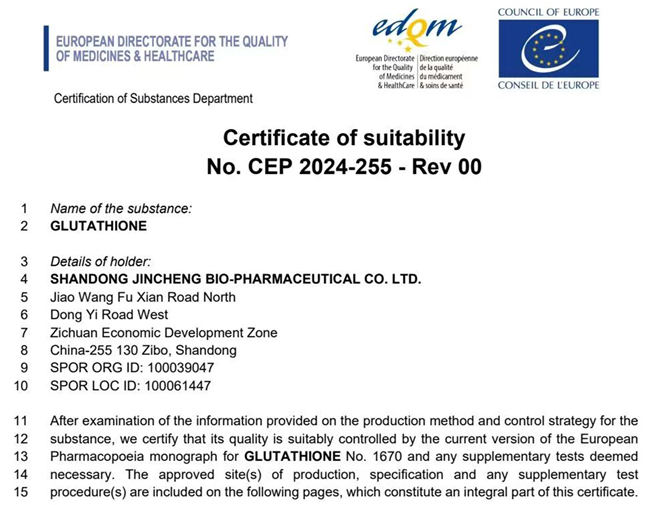 所在位置:首页 - 新闻中心近日,金城医药集团全资子公司山东金城生物药业有限公司收到欧洲药品质量管理局(EDQM)签发的谷胱甘肽原料药欧洲药典适用性证书(简称“CEP证书”),标志着公司谷胱甘肽产品获得欧洲官方的认可。
